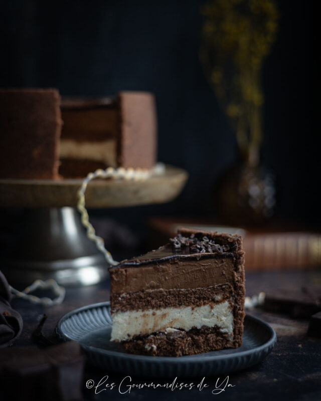 J-1 : Feuillantine au chocolat noir, bavaroise vanille, mousse chocolat noir, sirop d’imbibage et montage