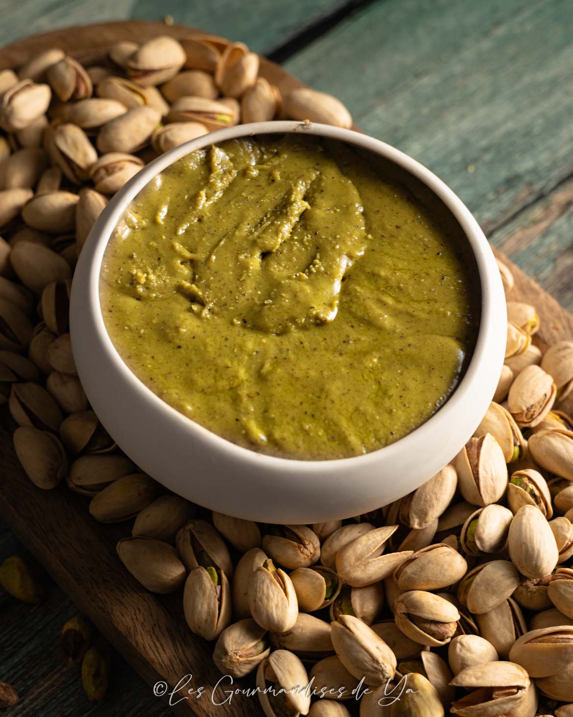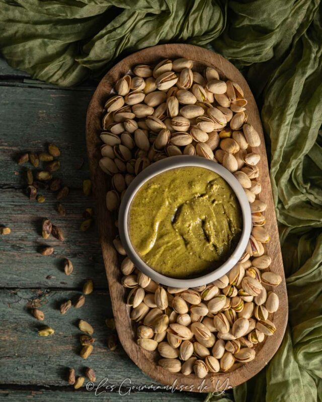 Si vous préférez une version plus naturelle et sans sucre, vous pouvez réaliser une purée de pistache. Pour cela, il suffit de mixer simplement 200 g de pistaches pelées et grillées avec 2 c. à soupe d’huile neutre (de pépins de raisin par exemple) jusqu’à obtention d’une texture lisse.